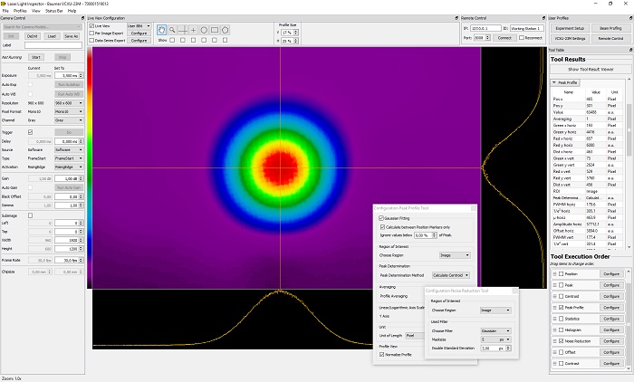 Dank unserer flexibel einsetzbaren Overlay- und Bildverarbeitungstools inklusive Rauschunterdrückungsfilter, Kontrastanpassung, Offsetkorrektur, Schwerpunkt- / Peakbestimmung und Gauß-Fit können Laserstrahlen bis ins Detail charakterisiert werden.